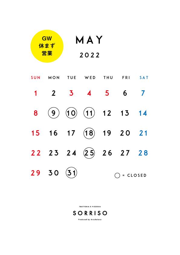 いつもSORRISOをご利用頂き、ありがとうございます\(^o^)/GWは休まず営業しております♪カレンダーの○の付いている日はお休みとさせていたたきますので、よろしくお願いしますm(_ _)m