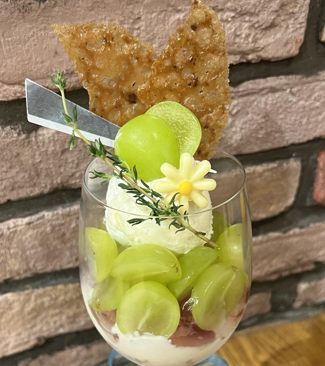 フレッシュな果実にヨーグルトの酸味、バニラアイスとブドウゼリーの甘みがマッチし、ナタデココの食感も楽しい、パティシエールおすすめのパルフェです。