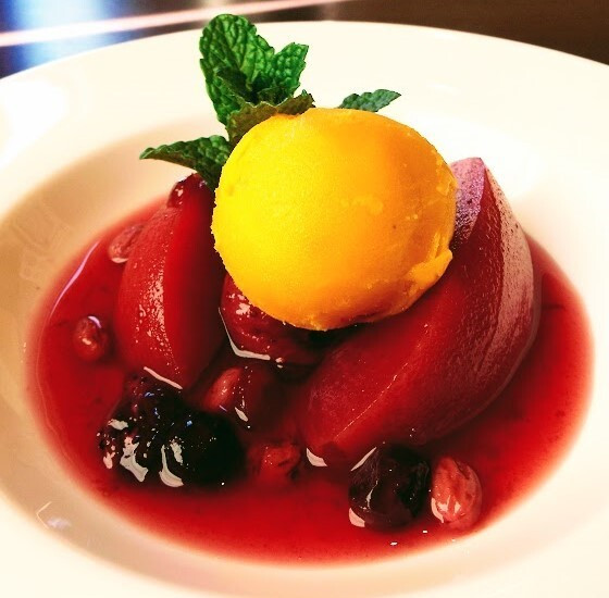 ワインとシロップで軽く煮たデザートです。