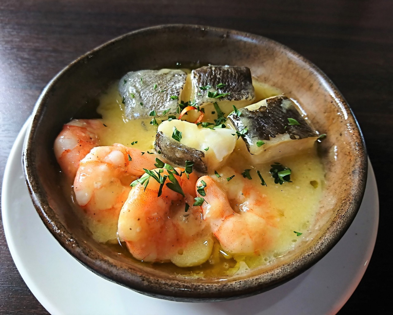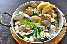 あさりを白ワインで蒸し、甘塩だらを加えて煮込み、パセリで仕上げたバスク伝統料理の一つです。 海老のアヒージョとタラのピルピルを一つにしました。