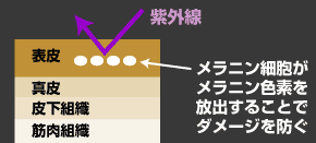 人間の肌の色を決めるのがメラニン細胞の数です。色白の人は元々メラニン細胞の数が少なく、色黒の人はメラニン細胞の数が多いからです。数が少ないということは、紫外線に対して抵抗力が弱いということになります。色白の人に、シミやソバカスが多いのは、太陽の紫外線を浴びることで、メラニン細胞が壊されてしまうからです。また、色白の人と色黒の人が同じ時間焼いた場合、色に違いが出てくるのも、メラニン細胞の数の差に原因があります。まずメラニン細胞の数を増やすことから始めなくてはならないからです。