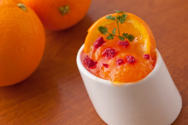 マスカルポーネクリームとオレンジのジュレを器の中に流しこみました。 |