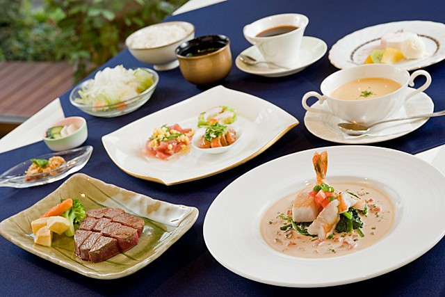 | ・アミューズ ・前菜盛り合わせ ・スープ ・フランス風海鮮料理 ・ステーキ(豪州牛フィレ) ・サラダ ・ライスorパン ・デザート ・コーヒーor紅茶 ※シャンパン1杯サービス |