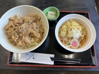 本日の日替わりは豚丼とミニ冷やしたぬきうどんです。