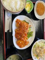 本日の日替わりは鶏のチリソース炒めです。 今週の土日限定デザートはバナナケーキです。