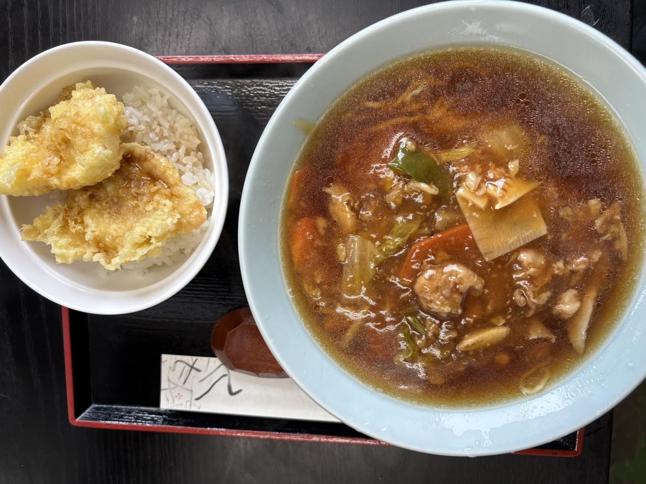 本日の日替わりは広東麺とミニ鶏天丼です。