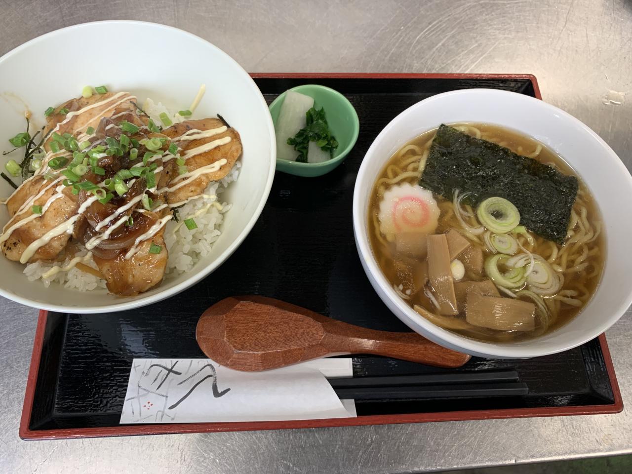 本日の日替わりは照り焼きチキン丼と半ラーメンです。