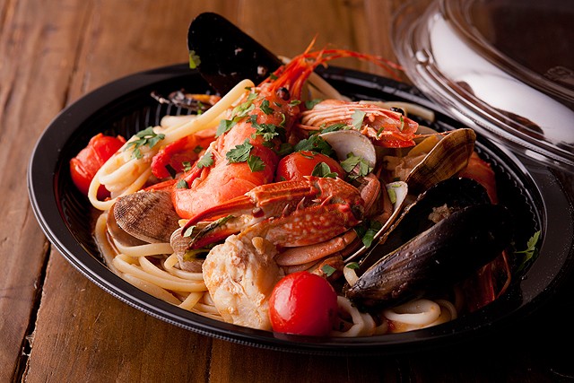 | マリナーラ +いろいろな魚介類、オリーブ、チェリートマト、ケッパー S:2500円/M:2900円/L:3700円(税込) ※魚介類は仕入れ等により随時変わることがあります |
