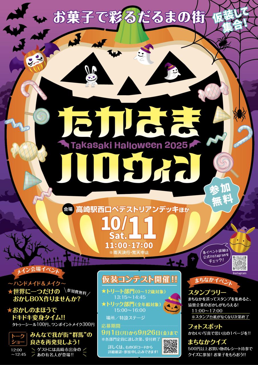 \\仮装して集合!!// 今年も開催します☆ 『たかさきハロウィン2025』 ■イベント内容 【メイン会場イベント】 ・世界に一つだけのおかしBOX作りませんか?(参加無料) ・おかしのまほうでドキドキ変身タイム!!(有料) ・高崎市出身のあの有名人が登場!トークショー 【まちなかイベント】 ・スタンプラリー(参加無料) ・フォトスポット ・まちなかクイズ(500円以上のお買い物レシートで参加) 【仮装コンテスト】 応募期間:9月1日~9月26日 ・トリート部門(0~12歳対象) ・トリック部門(全年齢対象) 詳しくはInstagramまたはXをご確認ください。 ■アクセス 【車】関越道高崎ICより約15分 【公共交通】JR高崎駅西口すぐ ■駐車場 周辺の有料駐車場をご利用ください。 >>>>>詳しくはこちら<<<<< 【Instagram】 https://www.instagram.com/tkskhalloween/ 【X】 https://x.com/tkskhalloween ※掲載後に日程や時間等が変更になっている場合がございます。お出かけ前には公式サイト等をご確認ください。 |