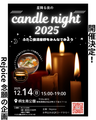 冬の夜に、心も身体も温まる特別なイベント「星降る夜のキャンドルナイト」を開催します! ♡イベントの魅力♡ 【 幻想的な光の絨毯】 無数のキャンドルが織りなす、温かく優しい光の空間で、日常を忘れるひとときをお届けします。 【ふたご座流星群を観察】 イベント開催の夜は、なんと三大流星群の一つ「ふたご座流星群」の活動が活発な時期! ロマンチックなキャンドルの灯りの下で、流れ星を探してみませんか? 【ほっこりタイム】 冷えた身体を温めるあたたかいフードをご用意します! 温かい飲み物や美味しい食事を味わいながら、大切な人とゆったりとした夜のひとときをお過ごしください。 ■アクセス ・北関東道 太田神戸スマートICより約10分 ・北関東道 太田桐生ICより約15分 ・北関東道 太田薮塚ICより約20分 ■駐車場 公園駐車場をご利用ください >>>>>詳しくはこちら<<<<< Rejoiceインスタグラムアカウント https://www.instagram.com/rejoice_kiryu/ ※掲載後、日程や時間等が変更になっている場合がございます。お出かけ前にはオフィシャルサイト等をご確認ください。 |