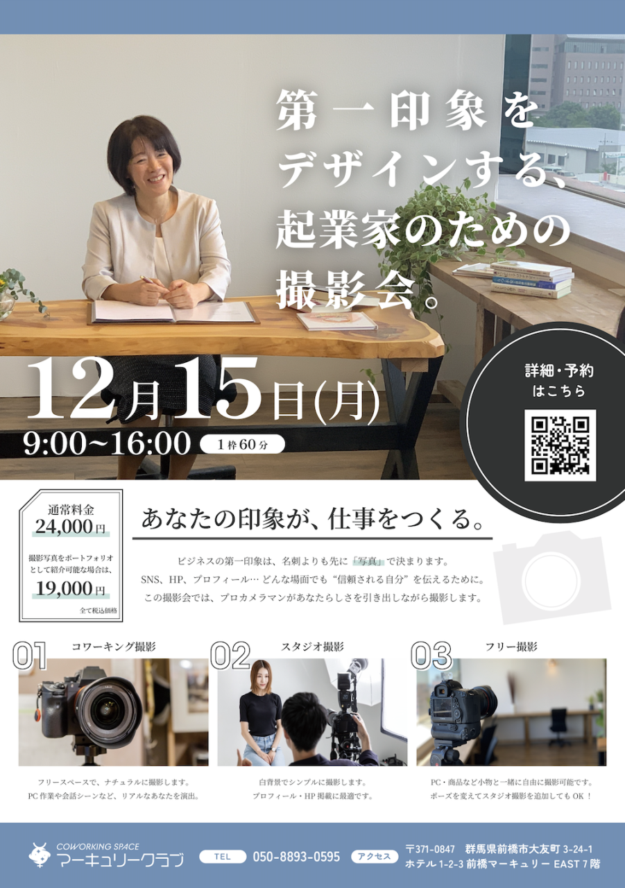 交流会へ行っても、誰がどの名刺の人だっけ?ってなりませんか? 相手方も同じように、翌日あなたの名刺を見て思っています。 どんな場面でも「信頼される自分」を伝えるために、 写真の印象は「記憶されるイメージ」として有効です。 この撮影会では、プロカメラマンがあなたらしさを引き出しながら撮影します。 【開催概要】 日時:2025年12月15日(月) 場所:マーキュリークラブ(ホテル1-2-3前橋マーキュリー内) 対象:起業家・フリーランス・経営者の方 ※これから開業する方も大歓迎! 定員:限定6枠/事前予約制 価格:通常 24,000円(税込) 特別価格 19,000円(税込) ※マーキュリークラブ、カメラマンの公式HPやSNS等で紹介可能な方は特別価格でご案内 |