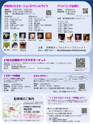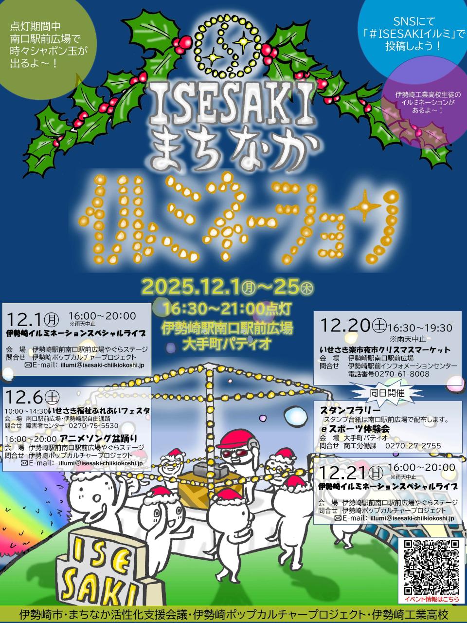 冬の伊勢崎駅前をイルミネーションで華やかに彩ります♪ 今年は関連イベントも多数開催!! イルミネーションとともにお楽しみください♪ ■内容 ・やぐらイルミネーション ・中央通路イルミネーション ・伊勢崎工業制作イルミネーション ・樹木イルミネーション ・外灯イルミネーション ■関連イベント ━━━━━ 『伊勢崎イルミネーションスペシャルライブ』 ミュージシャンやDJによる豪華なスペシャルライブ!! 12月1日(月)16:00~20:00 12月21日(日)16:00~20:00 ※雨天中止 会場:伊勢崎駅前広場 やぐらステージ ━━━━━ 『アニメソング盆踊り』 日本舞踊家である孝藤右近氏と、秋葉原の文化を世界に発信するササキチ氏によるアニソンを中心とした極寒の盆踊り大会!! 12月6日(土)16:00~20:00 ※雨天中止 入場無料 会場:伊勢崎駅前広場 やぐらステージ ━━━━━ 『いせさき楽市クリスマスマーケット』 12月20日(土)16:30~19:30 ※雨天中止 会場:伊勢崎駅南口駅前広場、大手町パティオ ━━━━━ 『スタンプラリー』 スタンプを集めて限定のくわまるグッズをゲットしよう! 12月20日(土)16:30~19:30 ※雨天中止 会場:伊勢崎駅南口駅前広場ほか ━━━━━ 『eスポーツ体験会』 12月20日(土)16:30~19:30 ※雨天中止 会場:大手町パティオ ━━━━━ ■アクセス JR両毛線・東武伊勢崎線 伊勢崎駅より徒歩1分 駐車場は、17~21時までの間は駅北側駐車場を利用できます。 ベイシア駐車場の利用は固くお断りさせていただきます。 >>>>>詳しくはこちら<<<<< 伊勢崎市ホームページ https://www.city.isesaki.lg.jp/sangyo_nyusatsu_kaihatsu/kaihatsu_kenchiku/chushinshigaichi/16817.html ※掲載後、日程や時間等が変更になっている場合がございます。お出かけ前には公式サイト等をご確認ください。 |