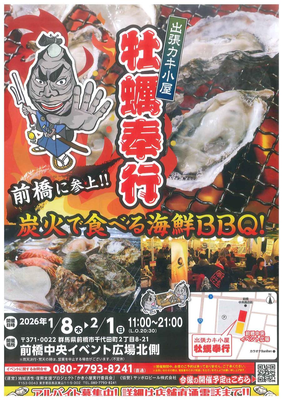 炭火で食べる海鮮BBG、前橋に参上!! 目玉は『旬の宮城県産のカキ』一盛り※焼きガキ用 復興支援価格 880円(税込)でご提供 その他、カキ料理をはじめとした新鮮な海産物、おつまみ、アルコールなどをご用意してお待ちしています!! ■メニューの一例 ・焼きガキ用カキ盛り ・カキご飯 ・カキフライ ・カキ汁 ・海産物各種(あわび、ホタテ、サザエ等) ・おつまみ各種(枝豆、唐揚げ、ポテト等) ・生ビール ・ハイボール ・焼酎 ・日本酒 ■ご注意事項 ・1名様につきお席代として390円(税込)頂戴いたします(未就学児無料) ・食材等のお持ち込みはご遠慮願います ・混雑時のみお席が90分制となります ・未成年またはお車を運転される方にはアルコール類の販売・提供はできません ・生牡蠣の販売は行っておりません ■アクセス 【車】関越道前橋ICより約15分 【公共交通】JR前橋駅より徒歩15分、上毛電鉄中央前橋駅より徒歩10分 ■駐車場 近隣の有料駐車場をご利用ください >>>>>詳しくはこちら<<<<< まえばしigoo https://www.igoo.info/events/event/6303 ※掲載後、内容が変更になっている場合がございます。お出かけ前には公式サイト等をご確認ください。 |