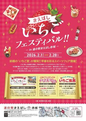 いちご推しの前橋市が贈る、早春の恒例イベントが今年もやってまいりました! 各店舗の職人たちが、今まさに旬を迎えるフレッシュないちごを使い、趣向を凝らした新メニューを考案! 昨年とは一味違う、ここでしか出会えない驚きとおいしさが一品一品に詰まっています♡ すべてが『道の駅まえばし赤城』だけの完全オリジナルメニュー。 この春、最高の一粒を体験しませんか? 各店のいちごメニューは、チラシPDFか下記サイトからチェックできます♪ ■同時開催イベント ◉いちごマルシェ 開催日:2月21~23日 場所:マーケット広場 ◉クイズラリー 開催日:2月1~28日 場所:道の駅内各所 対象:小学生以下(参加無料) ◉いちご風呂 開催日:2月21~23日 場所:まえばし赤城の湯 ■アクセス 【車】関越道渋川伊香保ICより約10分/駒寄スマートICより約10分 【バス】JR前橋駅より渋川駅行きバスで約25分「法華沢バス停」で降車後徒歩10分 ■駐車場 あり(約500台/無料) >>>>>詳しくはこちら<<<<< 道の駅まえばし赤城 https://maebashi-akagi.jp/amuse/post-17507 ※掲載後、日程や時間等が変更になっている場合がございます。お出かけ前には公式サイト等をご確認ください。 |