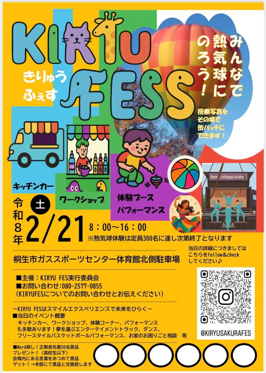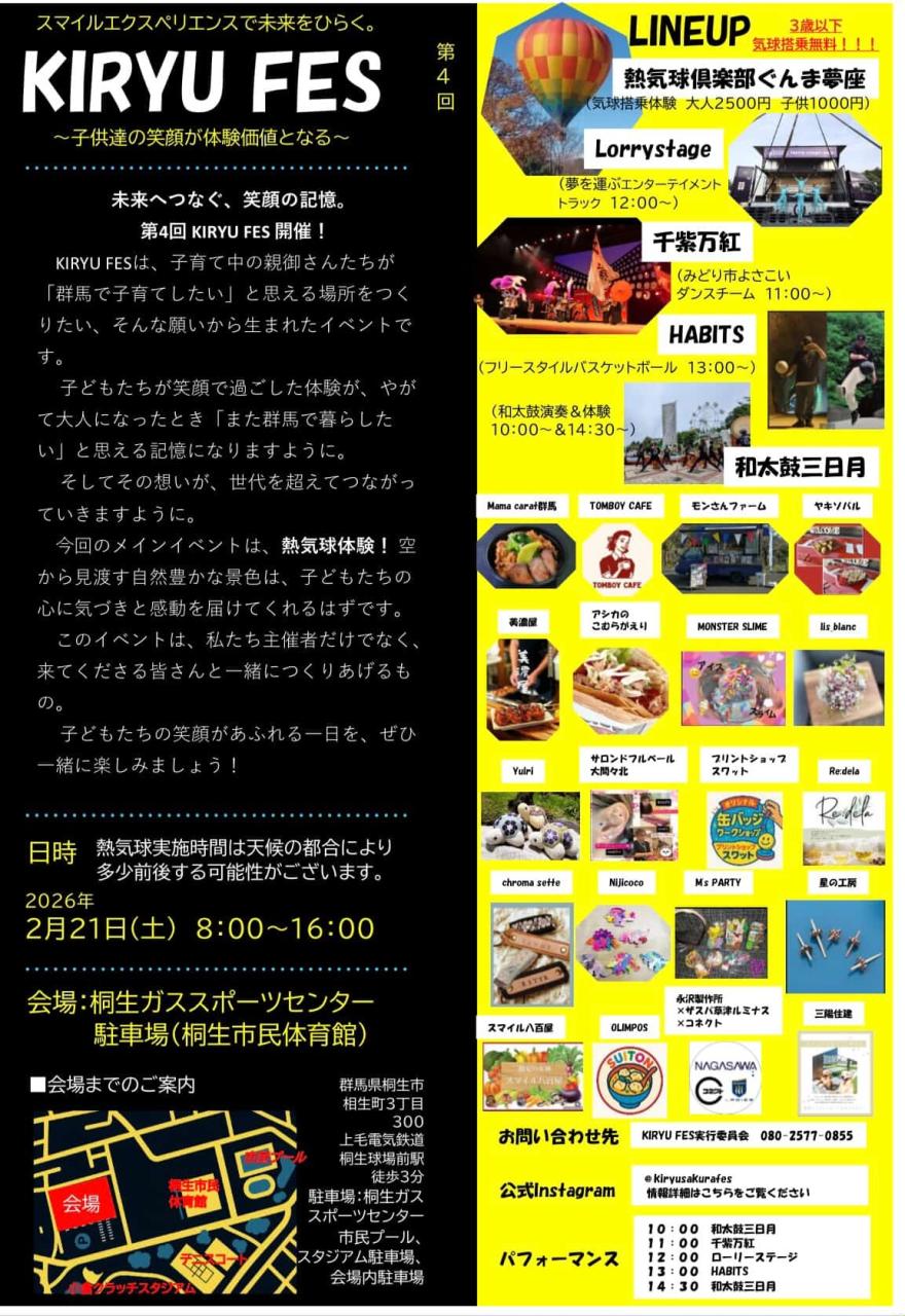 今回のKIRYU FESでは、初の試みとして熱気球搭乗体験を実施いたします。 準備段階からご覧いただけるため、早朝から楽しめる内容となっております。 ■コンセプト ~子供たちの笑顔が体験価値となる~ 子供たちの記憶に残る体験を創り、この地域で子育てしたいと思ってもらえるような、温かく魅力あるイベントを目指しています。 ■体験・パフォーマンス内容 ◉熱気球搭乗体験 ・3歳以下 無料(保護者同伴必須) ・大人 2500円 ・子供 1000円 ◉アクロバティックパフォーマンス(4トントラック使用) ◉よさこいダンス ◉フリースタイルバスケットボール ◉和太鼓演奏 など、多彩なステージコンテンツをご用意しております。 ■出店・ワークショップ ・キッチンカー多数出店 ・ワークショップ各種 ・気球搭乗写真をその場で缶バッジにできる体験 ・チラシの「ワード探し」企画(正解者先着50名にプレゼント) お子様から大人まで楽しめる内容が盛りだくさんのイベントです。 ■アクセス 【車】 北関東道太田桐生ICから約30分 北関東道太田藪塚ICから約25分 【公共交通】 上毛電鉄 桐生球場前駅・わたらせ渓谷鐵道 運動公園駅下車、徒歩約3分 ■駐車場 運動公園の駐車場をご利用ください >>>>>詳しくはこちら<<<<< Instagramアカウント https://www.instagram.com/kiryusakurafes/ ※掲載後、日程や時間等が変更になっている場合がございます。お出かけ前には公式サイト等をご確認ください。 |