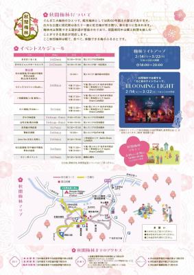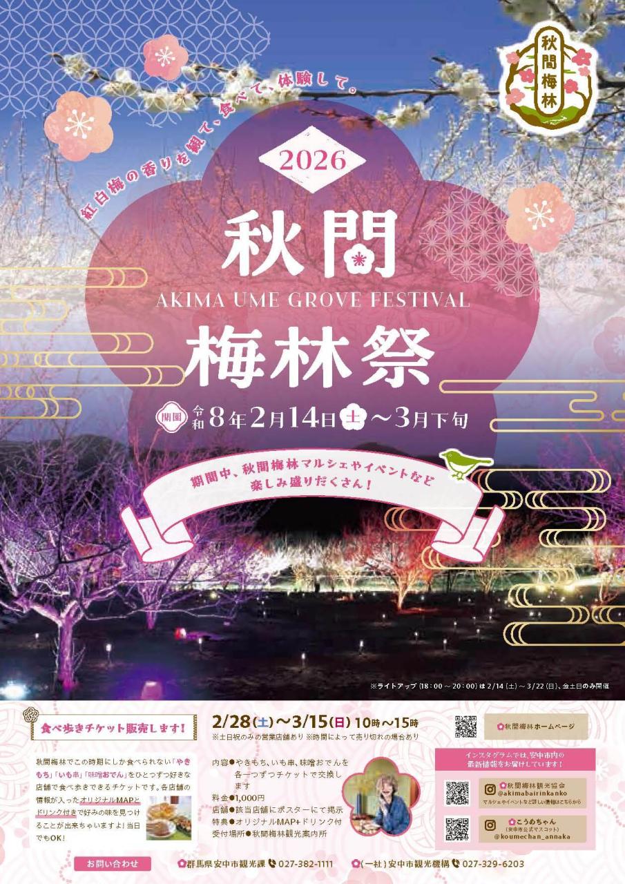 秋間川上流の丘陵地に広がり、「ぐんま三大梅林」のひとつである秋間梅林。 開花時期はあたり一面に紅白梅が咲き誇り、春の香りに包まれます。 梅林内は散策できる遊歩道が整備されており、開園期間中は郷土料理を楽しむことのできる売店も開店します。 早春の景色と秋間梅林グルメを楽しみに、ぜひお越しください。 ■主なイベント ・開花祭(2月28日) ・ライトアップ・BLOOMING LIGHT(2月14日~3月22日※金土日のみ) ・秋間梅林マルシェ(2月21日~3月15日※土日祝のみ) ・安中物産展(3月6日~8日) その他、楽器演奏なども開催予定 ■アクセス 上信越道松井田妙義ICより約20分 ※ナビご利用の際は「安中市西上秋間678-1」で検索 ■駐車場 PDFの案内図をご確認ください ■交通規制 開催期間中、一方通行や進入禁止になる場所があります。 PDF資料または下記サイトをご確認ください。 >>>>>詳しくはコチラ<<<<< 秋間梅林公式サイト https://akimabairin.com/ ※掲載後、日程や時間等が変更になっている場合がございます。お出かけ前には公式サイト等をご確認ください。 |