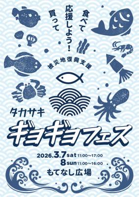 東日本大震災や大船渡市林野火災、能登半島地震で甚大な被害を受けた地域の復興を応援するため、「被災地復興支援 タカサキ ギョギョフェス」を開催します。 海がない高崎市で新鮮な海の幸を食べてもらい、楽しんでもらいたいと思っておりますので、ぜひこの機会にお出かけください。 ■内容 ・大船渡市からの出店 ・福島県からの出店 ・穴水町からの出店 ・高崎市からの出店 ・ラジオ高崎による特別番組の公開生放送 ・高崎おとまちプロジェクトによるミニライブ ・魚のつかみどり体験 ・オリジナルタンブラーの販売 ※出店店舗については下記サイトをご確認ください ■アクセス 【車】関越道 高崎ICから約15分/高崎玉村スマートICから約20分 【公共交通】JR高崎駅からバス約8分・徒歩約15分 ■駐車場 近隣の有料駐車場をご利用ください >>>>>詳しくはコチラ<<<<< 高崎観光協会ホームページ https://www.takasaki-kankoukyoukai.or.jp/?p=12406 ※掲載後、日程や時間等が変更になっている場合がございます。 お出かけ前には公式サイト等をご確認ください。 |