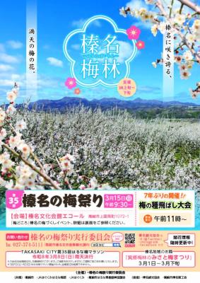 「ぐんま三大梅林」のひとつ、榛名梅林の梅づくしイベント!! 梅のほのかな香りに包まれながら春の祭りを楽しもう♪ ■内容 ・無料サービス(梅おこわ・甘酒・梅ジュース)10:00~ ・物産品即売(梅製品・梅うどん)10:00~ ・上州榛名太鼓保存会 9:30~ ・高崎経済大学GleeClub 10:05~ ・Яyokei(ギター弾き語り)10:30~ ・筝・尺八の会(小ホール)11:10~ ・チアダンスVenus 11:30~ ・梅の種飛ばし大会 12:05~ ・抽選会 13:00~ ■関連イベント 【はるなふれあいの郷「梅」フェア】 日程:3月1日(日)~3月31日(火) 商品:梅ジャム、甘露煮、カリカリ梅製品、その他多品種の梅干し 会場:JAはぐくみはるな農産物直売所 はるなふれあいの郷 【TAKASAKI CITY第35回はるな梅マラソン】 日程:3月8日(日)雨天決行 ※会場周辺で交通規制が実施されます ■アクセス 【車】関越道高崎IC/前橋ICより各約45分 【公共交通】高崎駅より群馬バス「里見経由室田(権田)行き」で約50分、エコール入口下車徒歩5分 ■駐車場 榛名文化ホールエコール駐車場 JAはぐくみ駐車場(祭り当日のみ駐車可/無料シャトルバスあり) >>>>>詳しくはコチラ<<<<< 榛名観光協会 はるなビ https://harunavi.jp/harunaumematsuri/ ※掲載後、日程や時間等が変更になっている場合がございます。 お出かけ前にはオフィシャルサイト等をご確認ください。 |