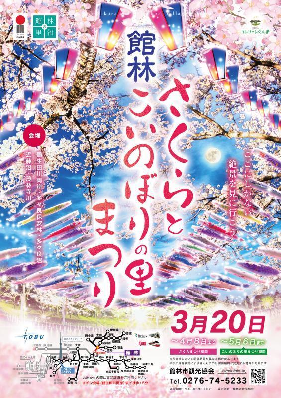 館林市の春の風物詩『館林さくらとこいのぼりの里まつり』が今年も開催されます。 さくらとこいのぼりが織りなす絶景を、ぜひご覧ください。 【さくらまつり】 市内3会場において開催。 多くの人で賑わい、夕方からはボンボリが点灯され幻想的な夜桜もお楽しみいただけます。 期間:3月20日(金・祝)~4月8日(水) 会場:鶴生田川両岸、多々良保安林、近藤沼公園 ボンボリ点灯は期間中18:00~21:00 【こいのぼりの里まつり】 市内4か所に約4000匹のこいのぼりが春風に吹かれ水面を揺らし期間:3月20日(金)~5月6日(水) 会場:鶴生田川、近藤沼、茂林寺川、多々良沼 >>>>>詳しくはコチラ<<<<< 館林市観光協会 https://www.utyututuji.jp/topics1/dsp.cgi?dtno=207 ※掲載後、日程や時間等が変更になっている場合がございます。 お出かけ前にはオフィシャルサイト等をご確認ください。 |