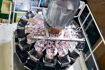 コンピュータスケールを使用したカリカリ梅の包装ライン |