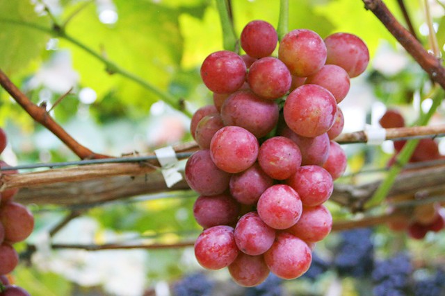 レインカット方式の栽培で、腰の高さで収穫できるので、子どもでも簡単にぶどう狩りが楽しめる。 |