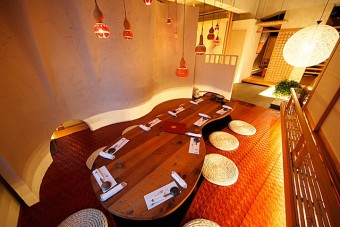 癒し系のひょうたんの照明が特徴のちょっとオリエンタルな雰囲気のお部屋。よく見るとテーブルの形も…。 |