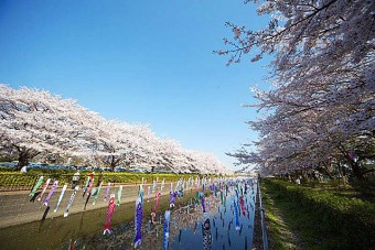 「鶴生田川」は、こいのぼりのライトアップで夜桜も楽しめる |