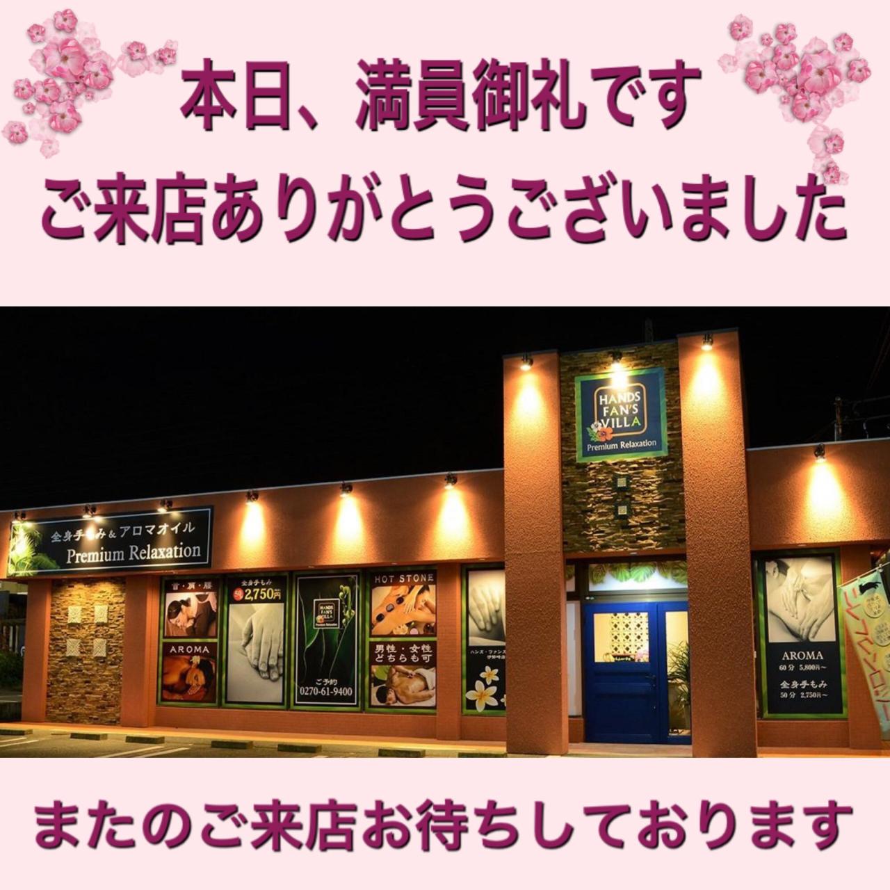 【オンライン予約はこちらへ】https://mitsuraku.jp/pm/online/index/s1k4o2 【オフィシャルサイト】http://isesaki.handsfans.com/ |