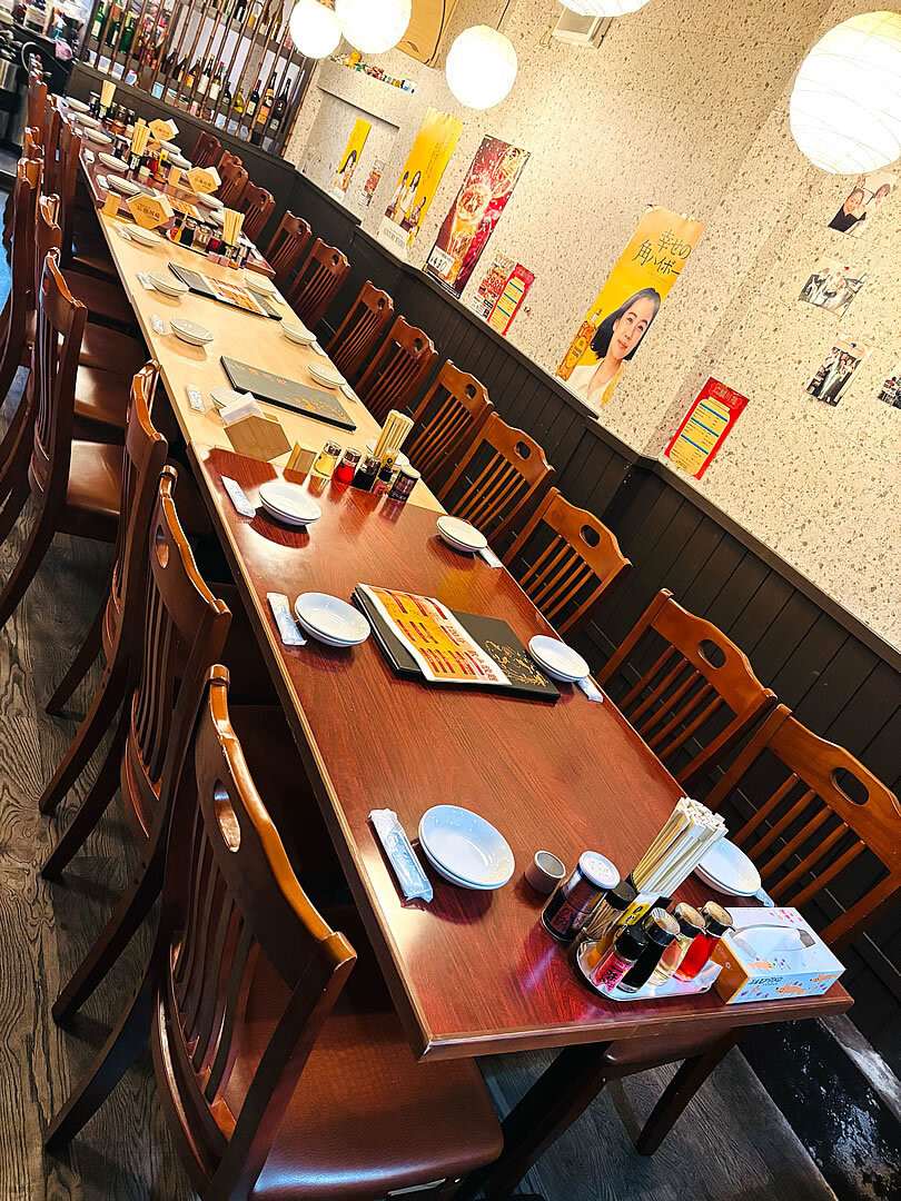前橋千代田町 広瀬川苑外観 オーナーシェフ自ら腕を振るう本格中華をご堪能ください 店内テーブル席 もっちもち食感が大人気の水餃子 ほぼ全品テイクアウトOK!中華オードもブルもご予約承れます。