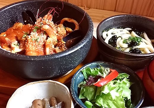 | ・石焼ビビンバ ・小付 ・サラダ ・漬物 ・手作り豆腐 ・味噌汁 ※味噌汁おかわりできます。 |