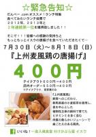 だんべー特集2連覇記念!!『上州麦風鶏の唐揚げ』を店内オーダー、テイクアウト共に感謝価格の400円で販売致します♪8月18日までの期間限定の価格でございます。この機会に是非いかがですか!?...