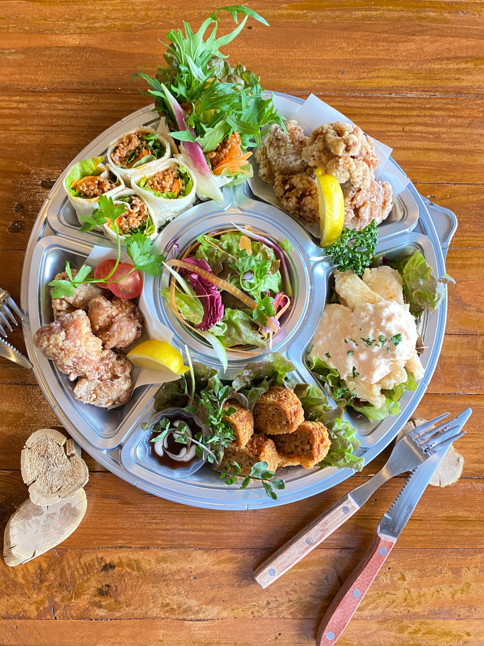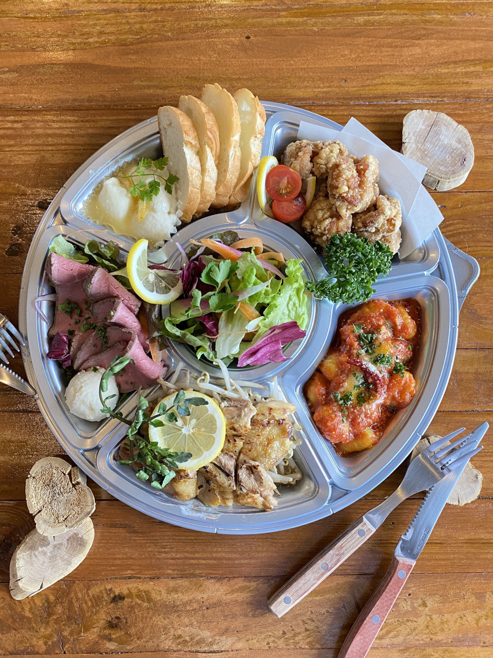 | 彩りサラダ自家製ドレッシング/低温調理ロースロビーフ/チーズ豆腐/正油からあげ/トマトニョッキ/麦風鶏ソテー~ジンジャーソース | 彩りサラダ自家製ドレッシング/正油からあげ/トルティーヤ/チキン南蛮/ピリ辛メンチカツ/塩からあげ | |||||