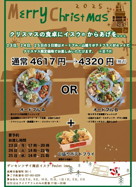 | ■ | オードブルA + 山盛りポテトフライ | 4320円(税込) | ■ | オードブルB + 山盛りポテトフライ | 4320円(税込) | |
