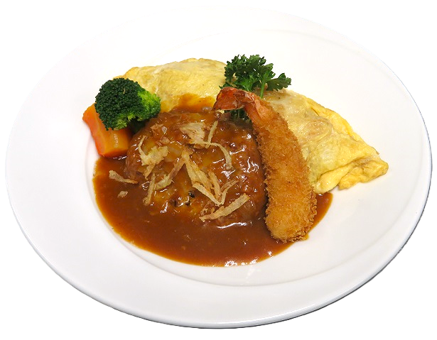 今風のオムライス、ライスの上に乗った半熟オムレツを