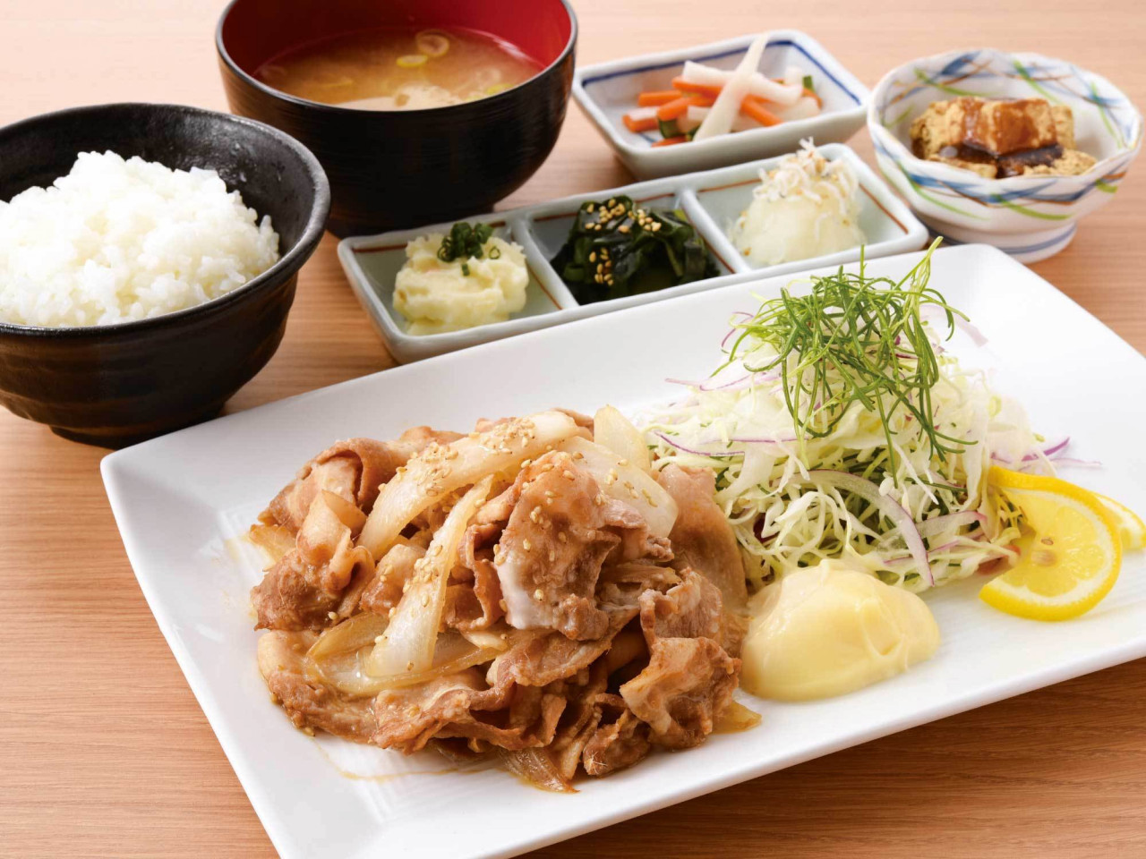 お肉、野菜盛り合わせ、薬味、ご飯、みそ汁、漬物