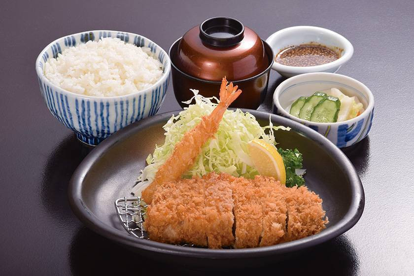 | ヒレかつ・刺身・茶わん蒸し・椀・お新香 |