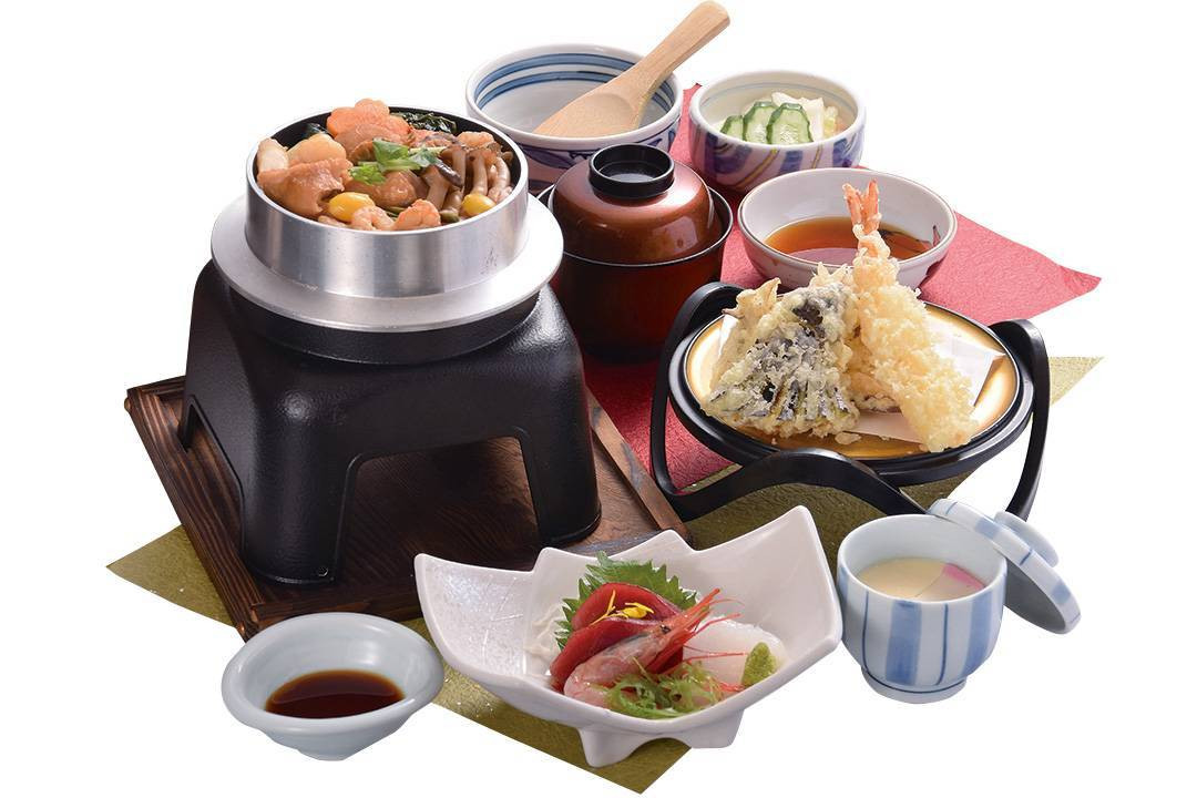 | 釜めし・天ぷら・刺身・茶わん蒸し・味噌汁・お新香 |