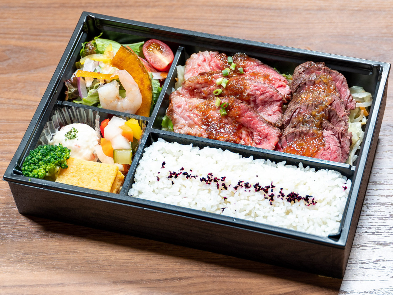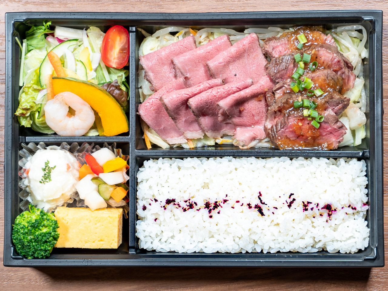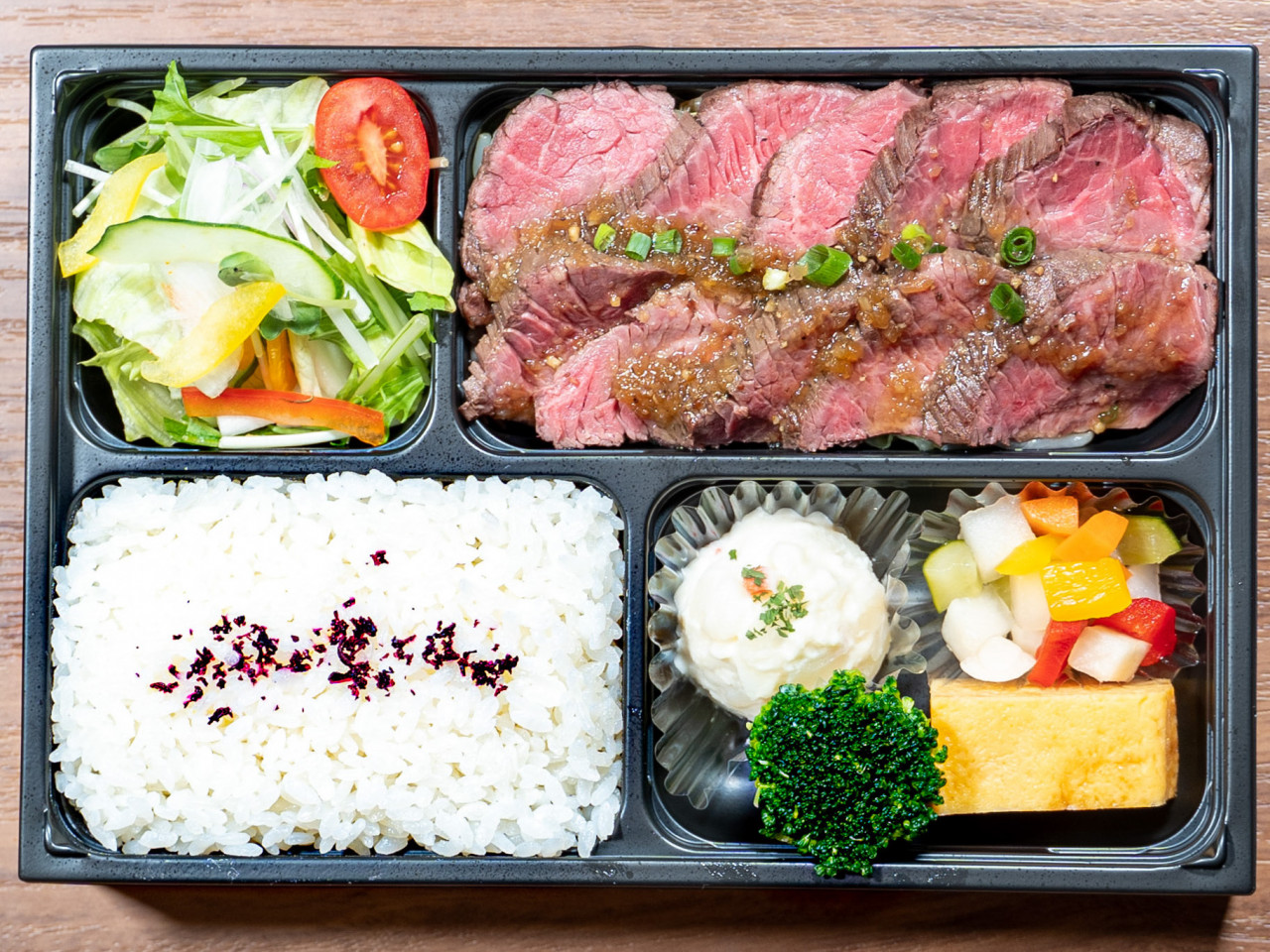 柔らかローストビーフのお弁当です。当店でも人気のお弁当で、お肉も贅沢にたっぷり入っています。