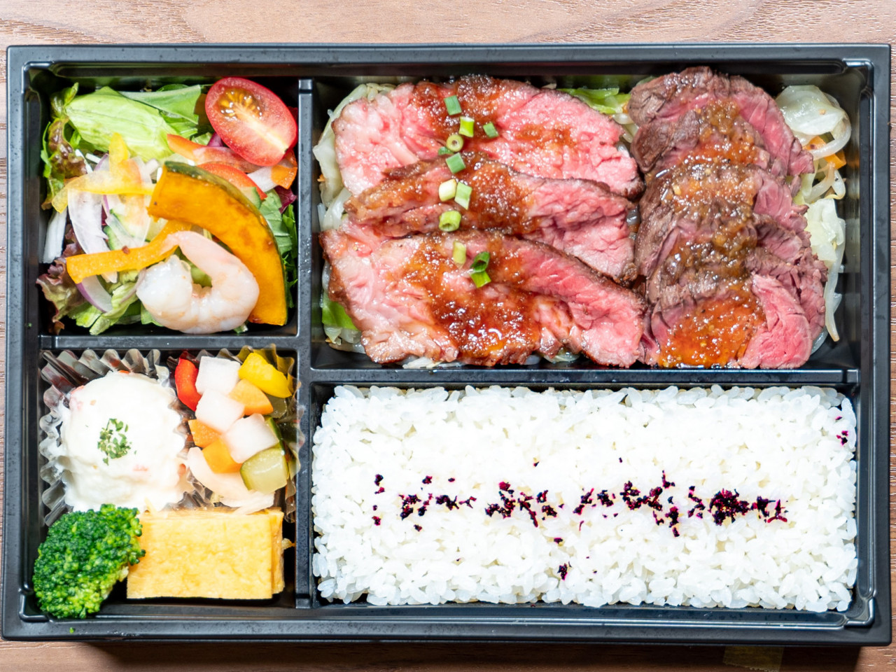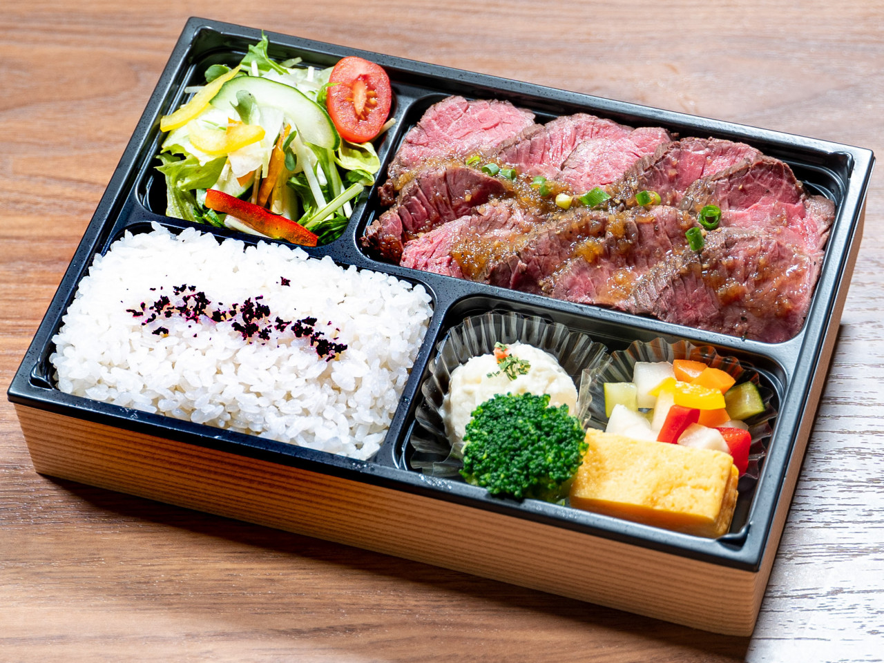 ミネラル、オメガ3、栄養満点の赤身100%のステーキ弁当です。赤身なのに柔らかく、味わいも深くとっても美味しいお肉です。