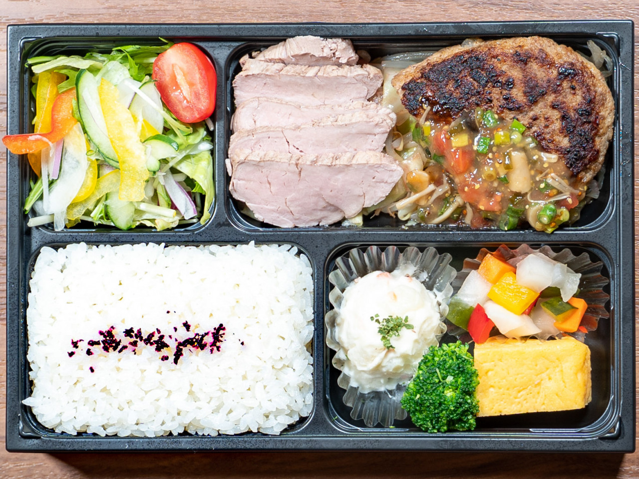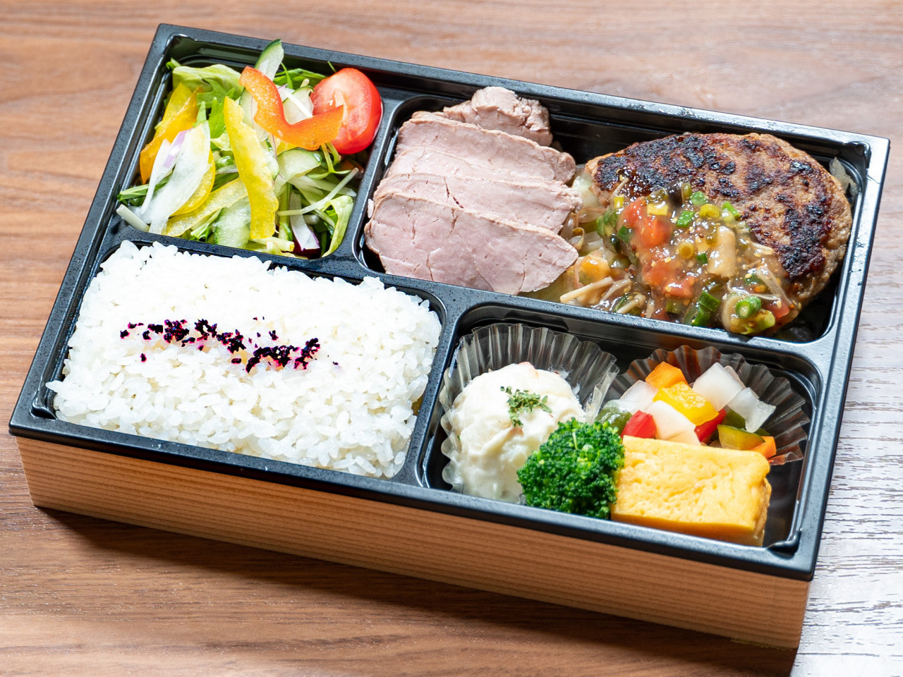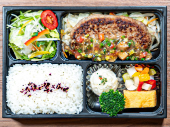 特製ハンバーグのお弁当です。しっとりと柔らかく焼き上げたハンバーグは冷めても柔らかいです。