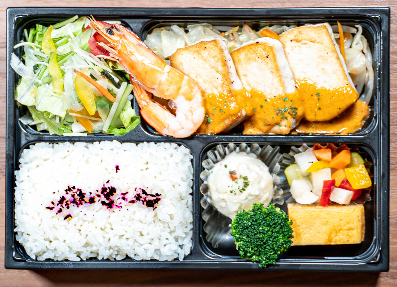 厚焼き玉子・ポテトサラダ・自家製ピクルス・サラダ・エビ・蒸し野菜