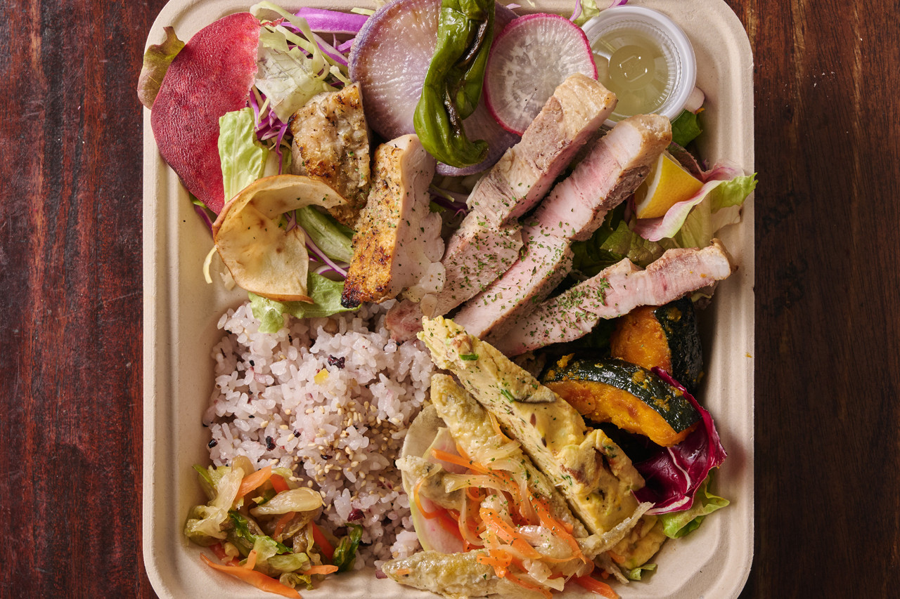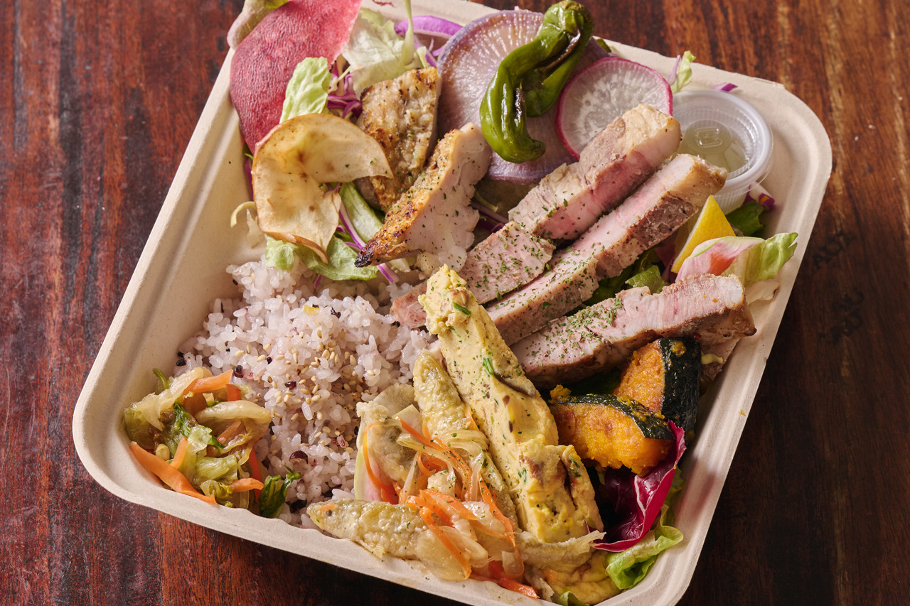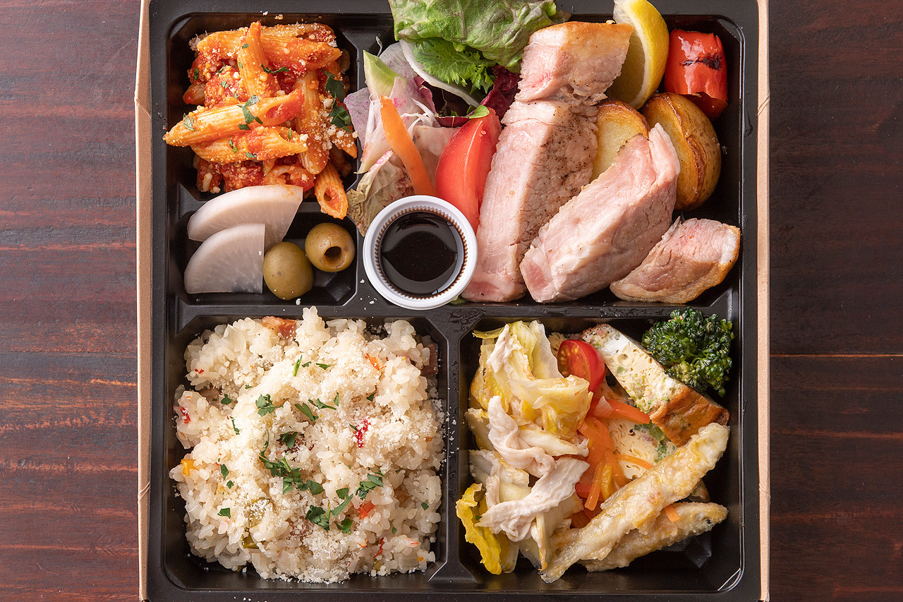 炭火で香ばしく焼き上げた鶏もも肉は、外は香り高く中はジューシー。噛むほどに広がる旨味が魅力の一品です。彩り豊かなイタリアン前菜とともに、満足感のある味わいを楽しめるお弁当です。