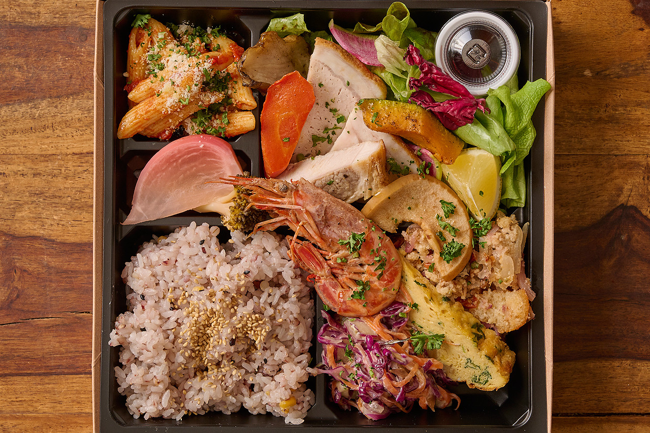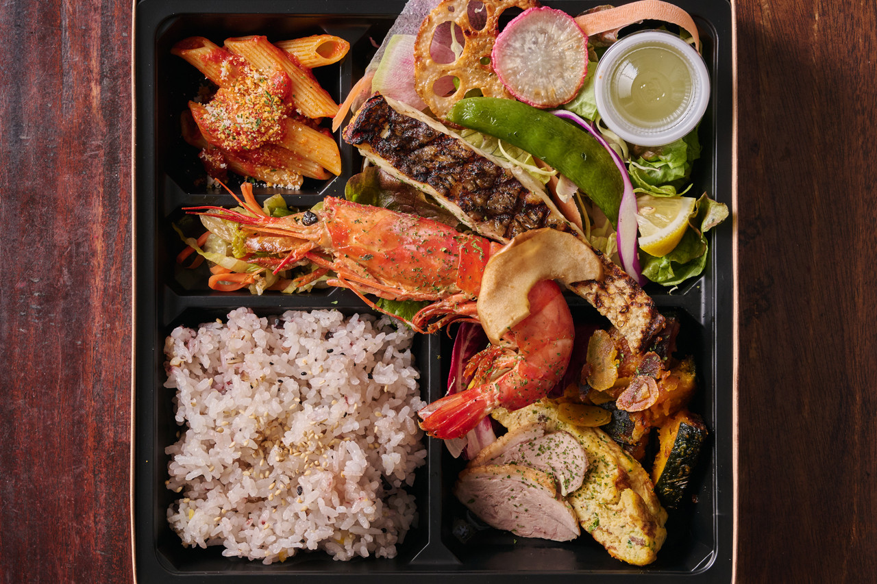 「渋川産まる豚のグリル弁当」にプラス旨味あふれる“赤海老のグリル”が楽しめるワンランク上のお弁当。