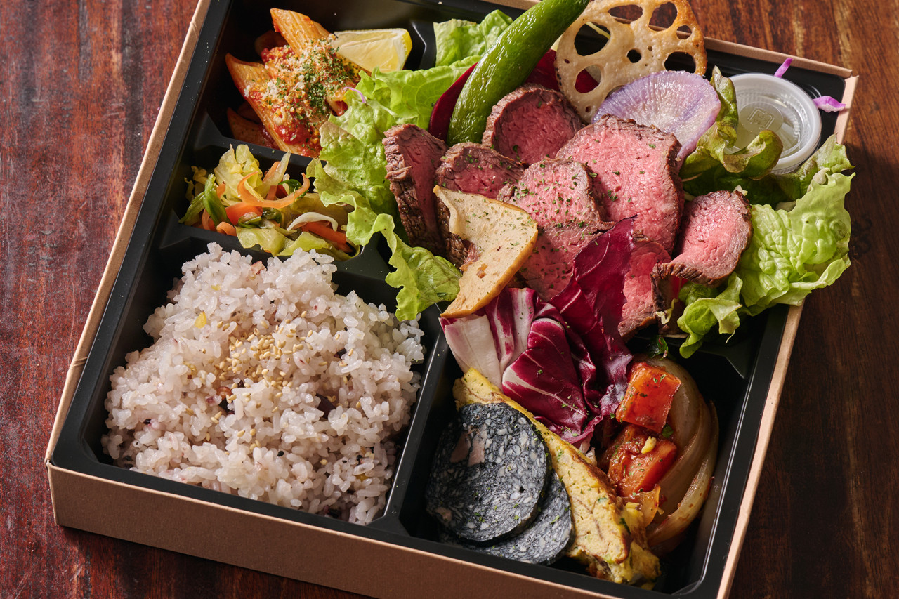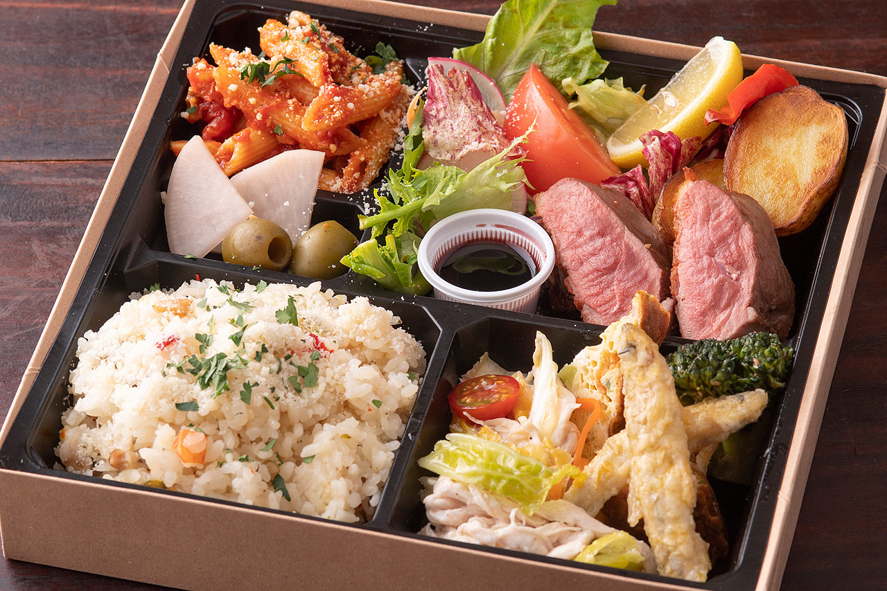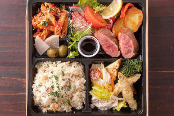 ネギや卵など群馬県産の食材にこだわり、自家製の割り下で仕上げた王道のすき焼きを楽しめる一折。イタリアンの彩り豊かな前菜とも相性がよく、和と洋の味わいを一度に楽しめる贅沢なお弁当です。