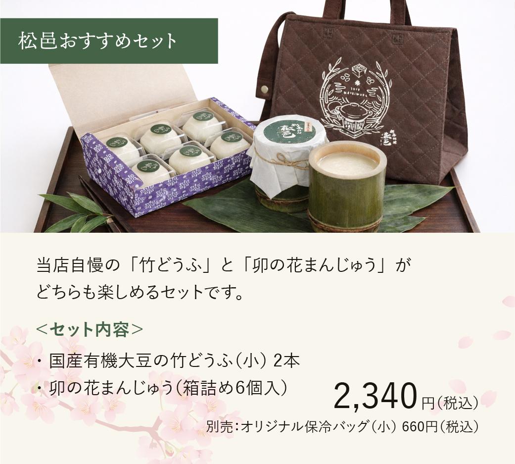 内容:国産有機大豆の竹どうふ(小)2本/卯の花まんじゅう(箱詰め6個入)