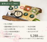 内容:国産有機大豆の竹どうふ(小)/湯葉の佃煮/湯葉丼の具/特濃すくいとうふ/おから酢の物/とろみ湯葉/とうふの西京味噌漬け/おからのサラダ