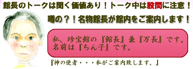 吉岡町に位置する上州の秘宝館群馬県北群馬郡吉岡町から伊香保方面へ向かうと見えてくるのが上州の秘宝館、『珍宝館』。 入口の門をくぐると庭園が広がる先を抜け建物の中へ。観覧する際には、珍宝館の使者、名物女将がご案内。 名物女将か繰り出す思わず笑ってしまう軽快なトークは必見です。 |