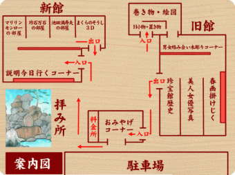 2000点以上の展示物は見どころ満載館内にある展示品は、小物、絵図、巻物、春画掛けじくなど幅広く取りそろえており、楽しませてくれる要素がいたるところにあります。また、珍宝館の守護神「べべ観音」も見物です。 観覧コースの最後には珍宝館の歴史についての展示コーナーがあり、珍宝館の歴史を探ってみるのも面白いかもしれません。 |
