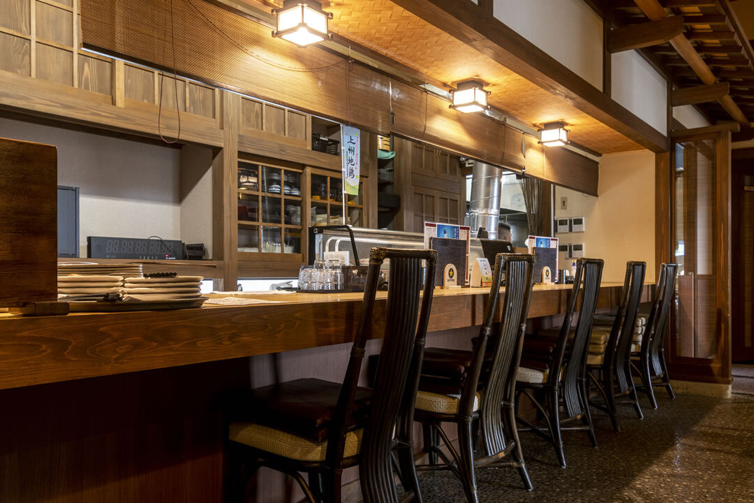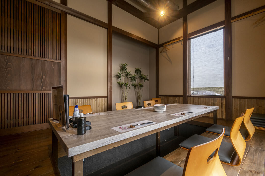 伊勢崎市下植木町、伊勢崎佐波医師会病院や粕川公園の程近くにある洒脱な一軒家風のお店です。店内はカウンター席とお座敷個室(掘りごたつ4室・お座敷テーブル席2室)を6室完備した、落ち着いて飲食を愉しむには最適な空間です。
