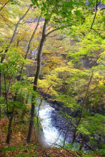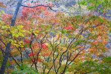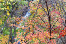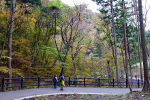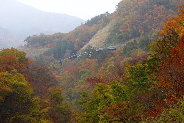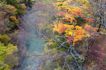 吾妻川沿いの遊歩道からは、色づいた木々と渓谷の青とのコントラストを望むことができます。2017年3月に架かった「猿橋」、吾妻川にかなり近づける赤い橋「鹿飛橋」周辺でも、紅葉狩りを楽しむことができます。駐車場は「吾妻渓谷パーキング」「十二沢パーキング」の2つがあり、ともに無料です。十二沢パーキングから猿橋までは5分ほど。 |
